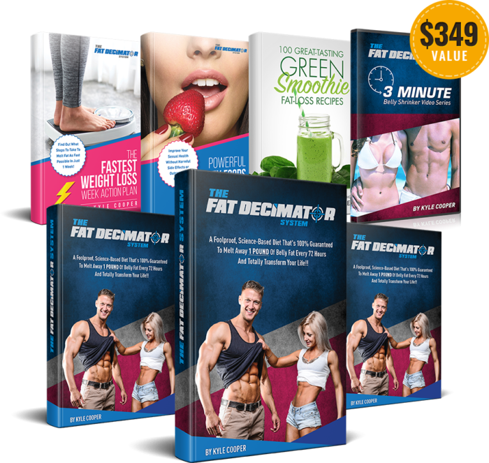 The fat decimator system is a collection of books and videos on the two topics of diet and exercise. The Fat Decimator System focuses on a science-based diet that allows you to lose 1 pound of belly fat every 72 hours. Kyle advises that some of the things we think regarding diet and exercise is wrong in terms of losing weight.